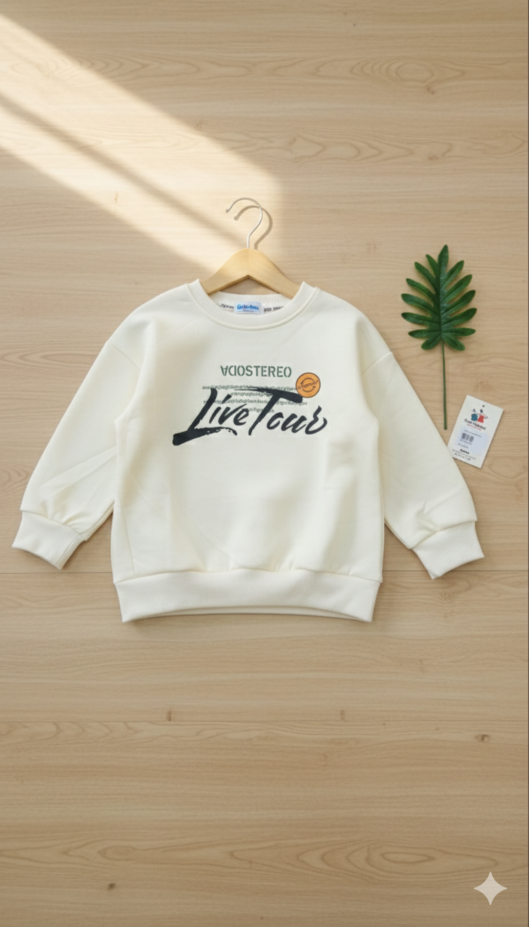 Elevate his streetwear collection with this premium cream-colored academic sweatshirt. Featuring a bold "Live Tour" graphic on the back and a clean, minimalist front, this oversized-fit pullover is designed for ultimate comfort and high-fashion urban appeal.